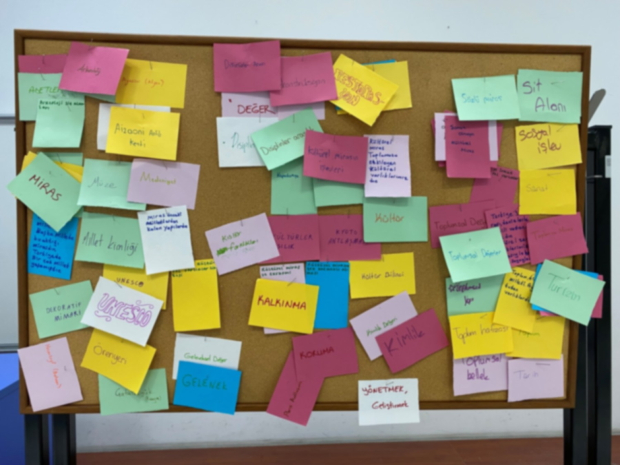 Ders sonu kazanımların ölçümü bağlamında sınıf içi etkinlik gerçekleştirilerek “Tüm dönem boyunca hangi kavram, yaklaşım, örnek, gelişme, gündem vd. neler öğrendiniz? (A’dan Z’ye) Panoya yapıştırınız” yönlendirmesi yapılmış olup birlikte Kültürel Miras ve Toplum Sözlüğü Panosu oluşturulmuştur.